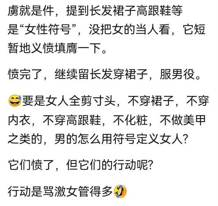 You could say that some of the core consensus of this group is:反婚反育反沾男、反“服美役”、主张性别分离,anti-marriage, anti-childbearing, anti-male contact, anti-beauty, advocate gender separation. Then, from this point of view, they believe that all men are potential or active oppressors and perpetrators. Men should be eliminated, and the problem of offspring should be solved by technological development (artificial insemination, cloning technology, artificial womb, etc.). Only by centering on women and formulating social rules according to women’s characteristics and nature can society operate harmoniously, peacefully, and naturally in an orderly manner. They promote that men’s characteristics are inferior and women’s characteristics are superior. Women have better physical constitutions and longer lifespans than men. Men are born war initiators, women are pacifists, and they promote that women are superior to men from all angles.
