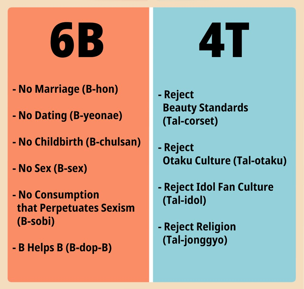 The 4B movement originated in South Korea, which means four “no’s": no marriage, no childbearing, no heterosexual relationships, and no sex with men. It was later expanded to 6B4T, adding two new principles: boycotting sexist products (비소비) and helping each other among 6B members (비돕비). In addition, 6B4T also opposes modern “corsets," the over-sexualization of women in Japanese otaku culture, religious beliefs, and idol culture.